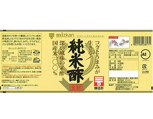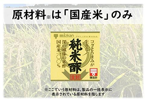 国産米だけを使って醸造したミツカン純米酢金封は、コクとうまみが生きる深い風味が特長です。酢の物、お寿司、サラダ、ピクルス、酢漬けなどのどんな料理にもお使いいただけます。【おいしいすし飯の作り方】[分量]合わせ酢:お米3合(180mlカップ3杯・4人前)、純米酢大さじ4、砂糖大さじ4-5、塩小さじ2[作り方]●お米は、炊く30-40分前に洗い、やや固めに炊き上げます。●ご飯が熱いうちにすし桶又はボールに移し合わせ酢を全体にまわしかけます。●ご飯を切るように(むらなく)混ぜうちわでさまします。
