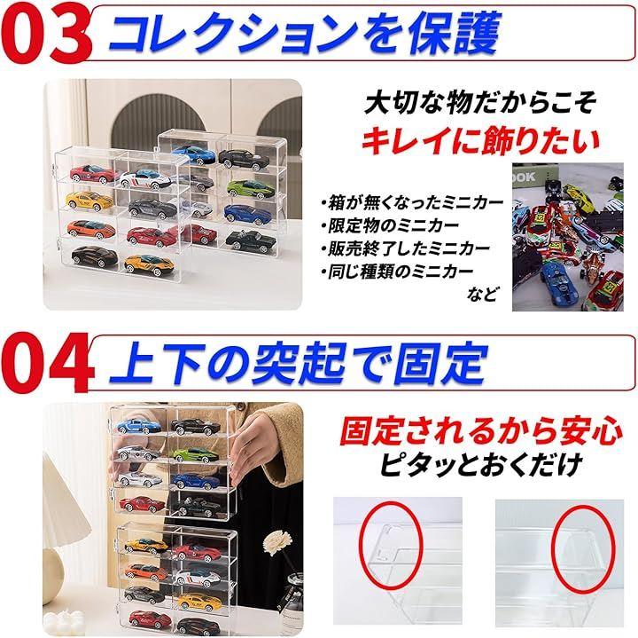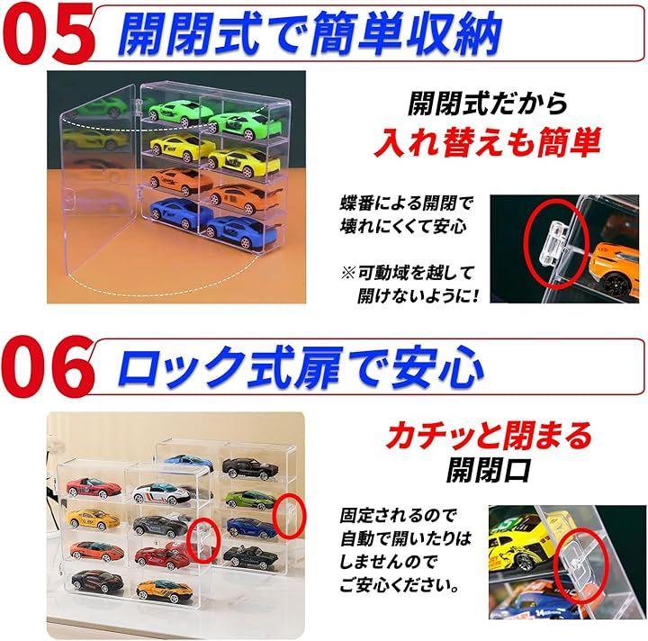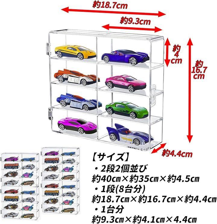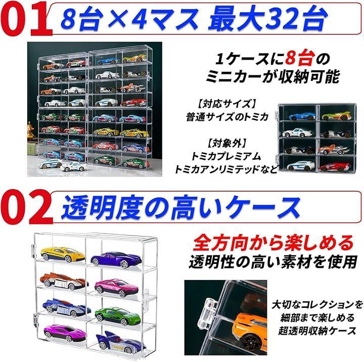 「最大32台をスマートに収納できるディスプレイケース」 8台x4段のレイアウトで、普通サイズのトミカを最大32台まで収納可能。