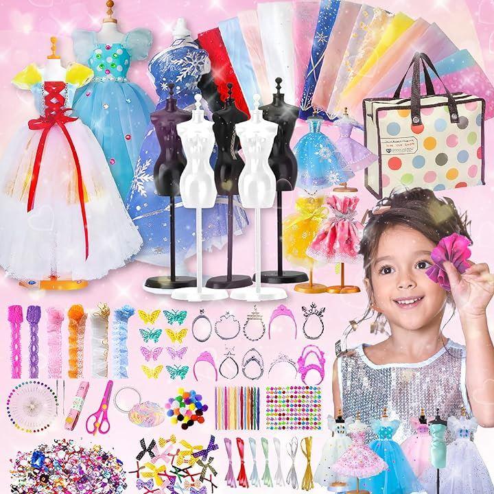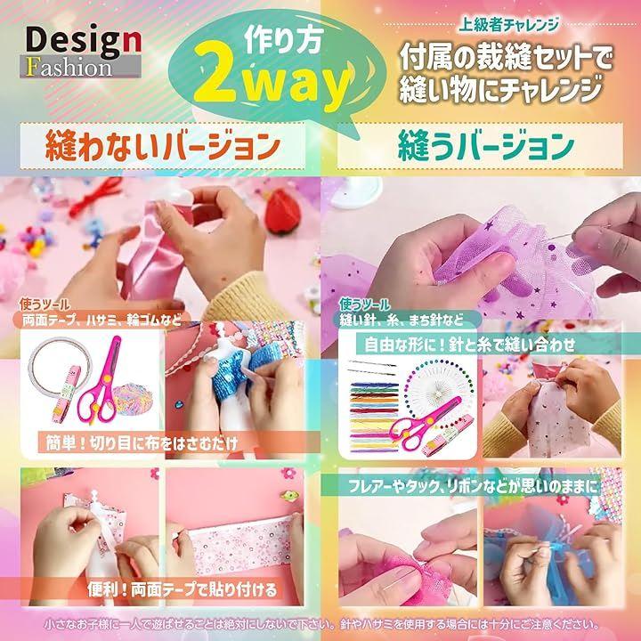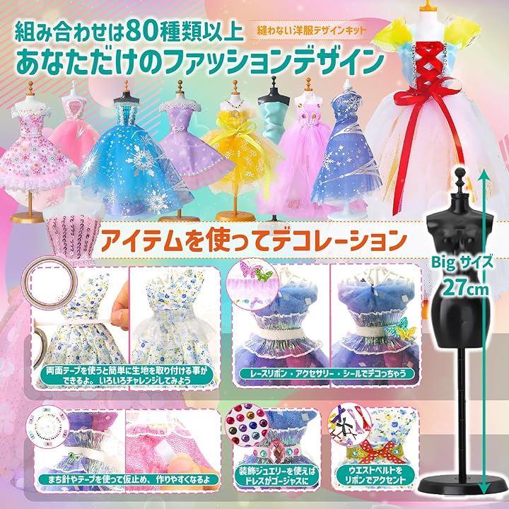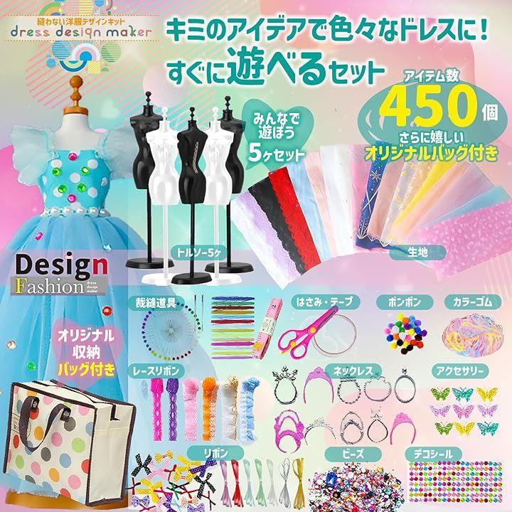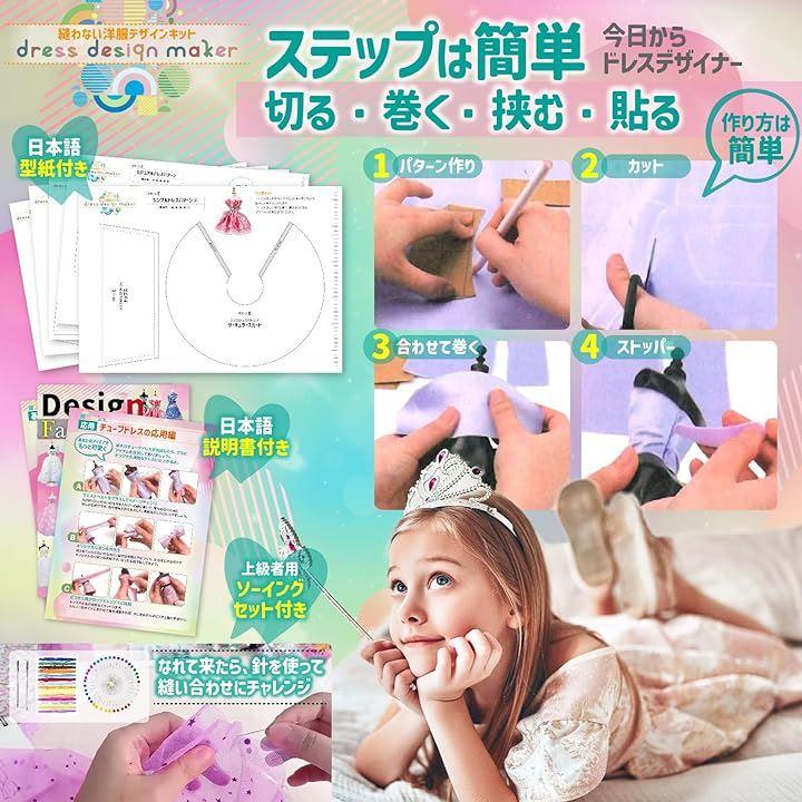 「セット内容」 ドールトルソー5個(27.5cm) 布とチュール、3種類のリボン生地、巻き尺1個、アクセサリーリボン、レースリボン、プリンセス風ネックレス、裁縫道具セット (針、子供用ハサミ1個、糸4色セット、両面テープ、糸通し、デコパーツ、ラインストーンシール) 日本語説明書、パターン(*小物の色やデザインは変更となる場合があります)
