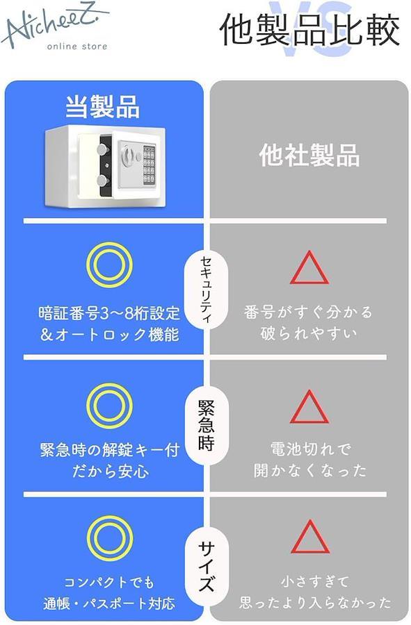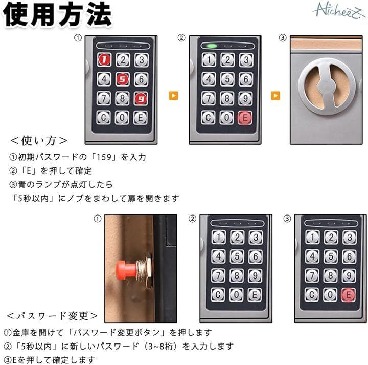「使用方法」◉使い方:(1)初期パスワード「159」を入力 (2)Eを押して確定します (3)青のランプが点灯したら5秒以内にノブを回してドアを開けます ◉パスワードの変更方法:(1)金庫を開けて「パスワード変更ボタン」を押します (2)5秒以内に新しいパスワード(3~8桁)を入力します (3)Eを押して確定します