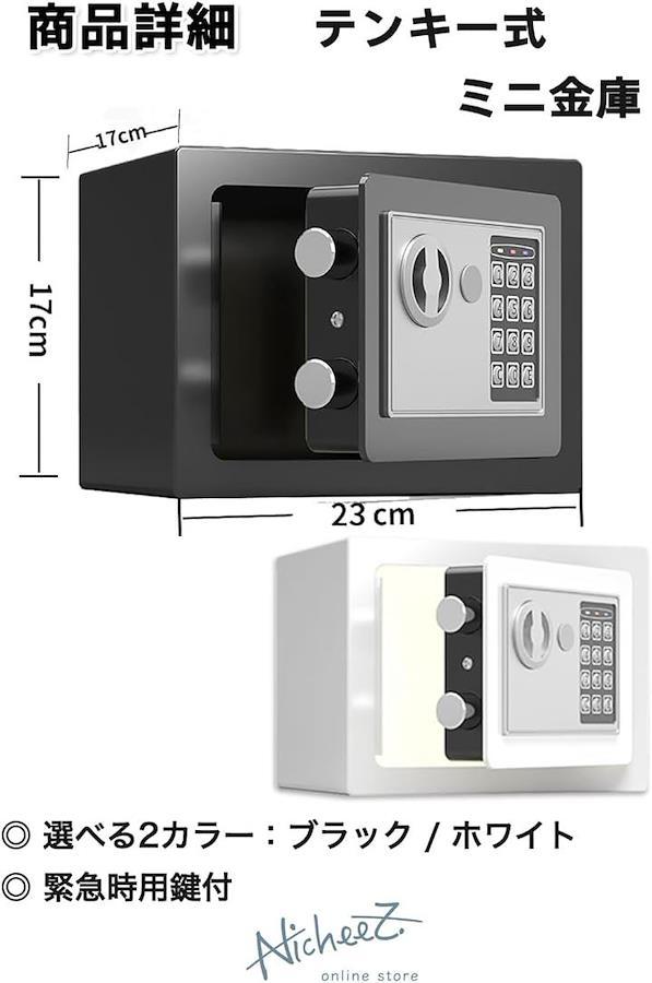 「商品内容」テンキー式ミニ金庫 カラー:ブラック/ホワイト サイズ:幅/約23cm 奥行き/約17cm 高さ/約17cm *日本語説明書付 *単三電池4本使用/電池付属無
