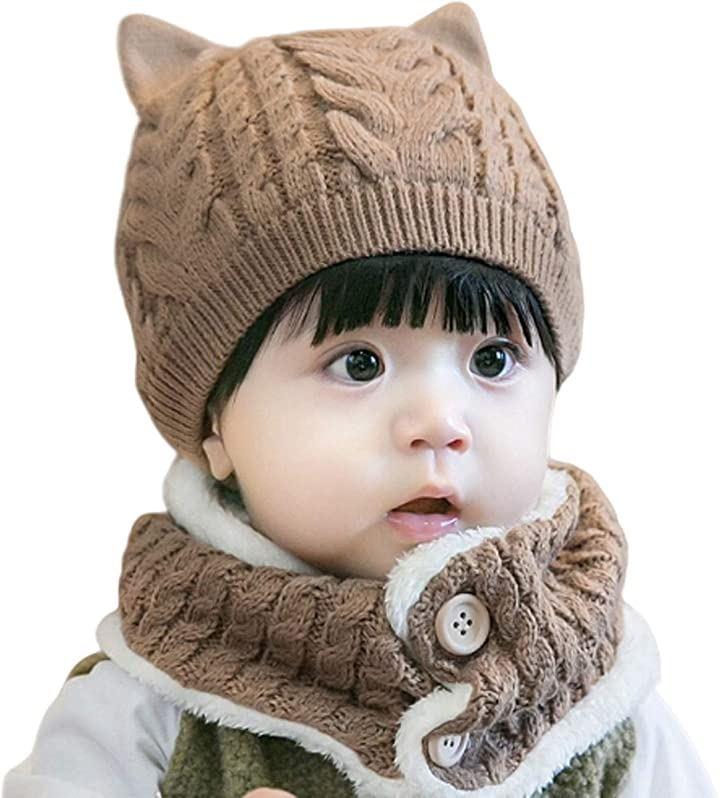[ミャオッティ]ベビーニット帽子ネックウォーマーセット赤ちゃん新生児冬耳付き防寒対策0~2歳フリーサイズ