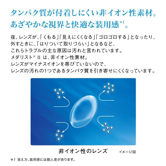 含水率59%による、ナチュラルなつけ心地*1 レンズに含まれた水分により、つけた瞬間から瞳にすっとなじむような 装用感*1をサポートします。 タンパク質が付着しにくい非イオン性素材。 あざやかな視界と快適な装用感*1 夜、レンズが、「くもる」「見えにくくなる」「ゴロゴロする」となったり、 外すときに、「はりついて取りずらい」となるなど、これらトラブルの主な 原因は汚れと言われています。 メダリスト? IIは、非イオン性素材。レンズがマイナスイオンを帯びて いないので、レンズの汚れの1つであるタンパク質を引き寄せにくくなって います。 ユニバランス デザイン つけはずししやすく、クリアな視界*1をサポート 「ユニバランスデザイン」とは、レンズの中心部からエッジにかけて、厚みの起伏を抑え、限りなく均一になるように設計したレンズデザイン。
