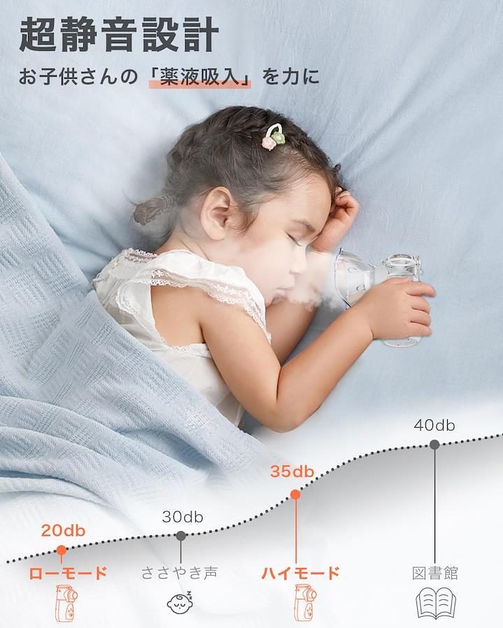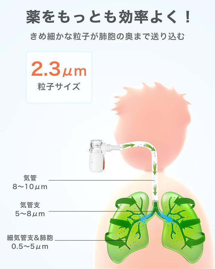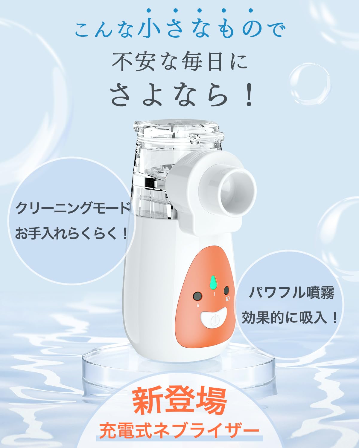 ?【新デザイン・充電式ネブライザー】従来の乾電池のような1回きりしか使えない電池の限界を突破した小型軽量かつ高性能なリチウムイオン電池を採用し、より使い心地よいType-C充電式ネブライザーが登場しております!電池自体の劣化を抑え、より大きな電気を蓄えられるようになり、どこでもいつでも毎日の吸入を楽におこなうサポートをします。 ?【噴霧粒子径2.3μm!効果が期待!】この吸入器は、超音波メッシュ技術を通じて、薬液を2.3μmのきめ細かな霧状にすることで、薬剤を呼吸と一緒にやさしく鼻、気管や肺胞の奥まで送り込むので、効率よく薬が作用することが期待できます! ?【特有のクリーニングモード!お手入れラクラク】特有のクリーニングモードを採用したこの吸入器は、お手入れ方法も易くして、薬液が残りにくく、メッシュプレートの目詰まりも発生できかねます。それに、シンプルな操作は、ひとつのボタンに絞ることです!シンプルな操作ではハイモード、ローモード、クリーニングモードの操作が可能です。さらに、明らかにわかるように、水位警告ランプと低電量警告ランプが設置され、自動的に止まってくれるため、お子どもからお年寄りまでどなたでも安心して操作が可能です。 ?【静音・軽量・コンパクト】従来のコンプレッサー式ネブライザに比べ動作音が静かな静音設計です。動作ノイズが50dBA未満で、外出先や夜中でも気にすることなく吸入できます。また、本体の重さはわずか102gと軽量です。手のひらサイズで場所を取らず、小さな子供でも握りやすく、持ち運びにも便利です。 ?【パケット内容・安心保証】パッケージ内容:ネブライザー本体*1、薬液カップ*1、マスク(子供用)*1、マスク(大人用)*1、マウスピース*1、メッシュ部カバー*1、収納袋*1、クイックマニュアル*1、取扱説明書*1、USBケーブル*1。本製品には1年間の保証期間があります。万が一の商品に不具合などが発生したら、弊社までご連絡いただきますようお願い申し上げます。その際は、迅速にご満足いただけるまで対応させていただきます。
