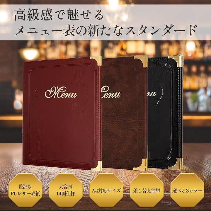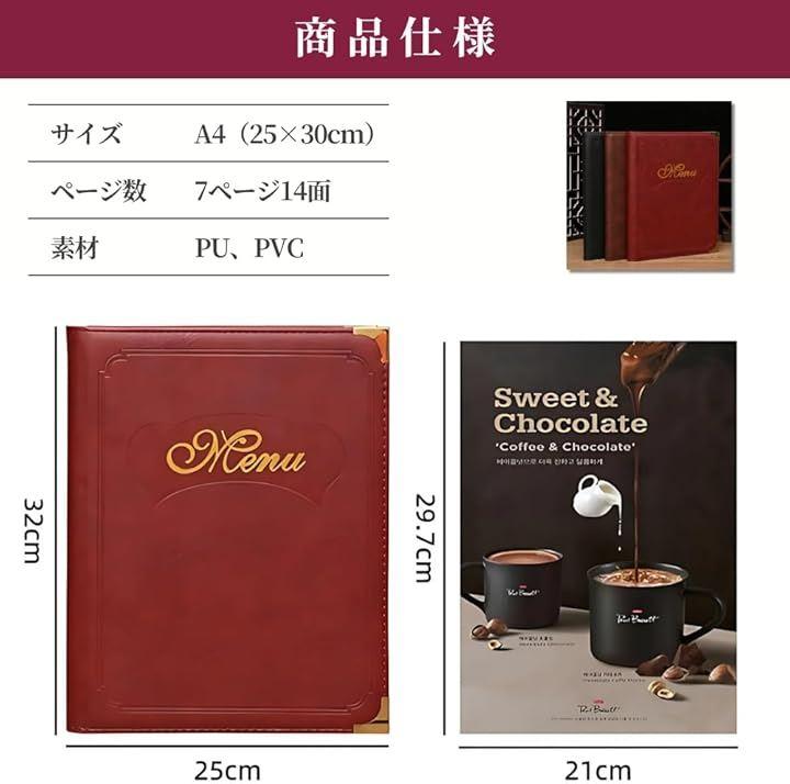 7ページ14面の大容量仕様で最大14枚のA4サイズのメニューを収納可能です。