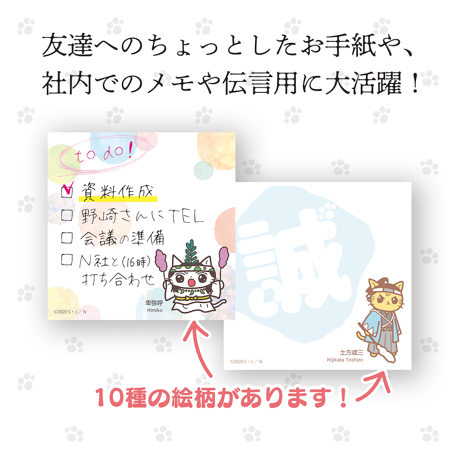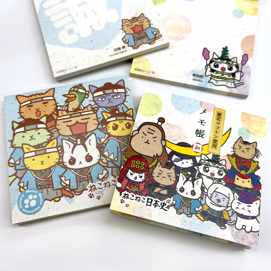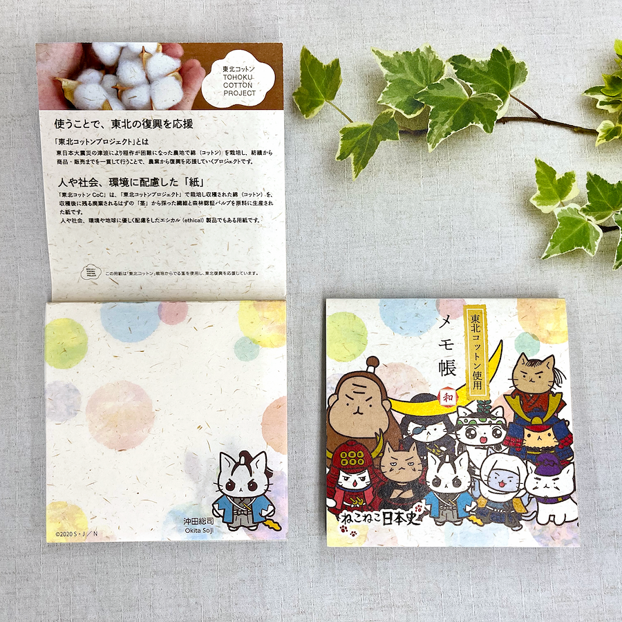 かわいい「ねこねこ日本史」のキャラクターをモチーフに東北コットンCoCを使用したメモ帳です。