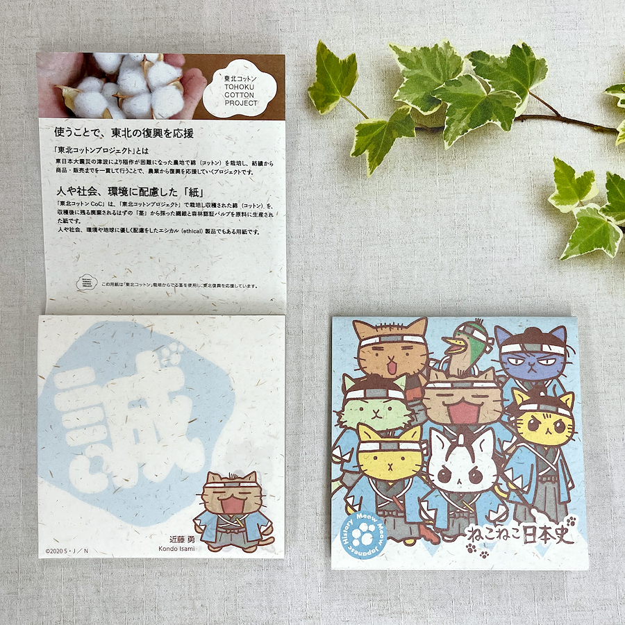 東北コットンCoCとは、東日本大震災の津波により、稲作が困難になった農地で綿(コットン)を栽培し、収穫後に残る廃棄されるはずの「茎」から採った繊維と森林認証パルプを原料に生産された紙です。繊維が漉き込まれていて、味わいのある風合いの紙に「ねこねこ日本史」キャラクターを印刷しました。