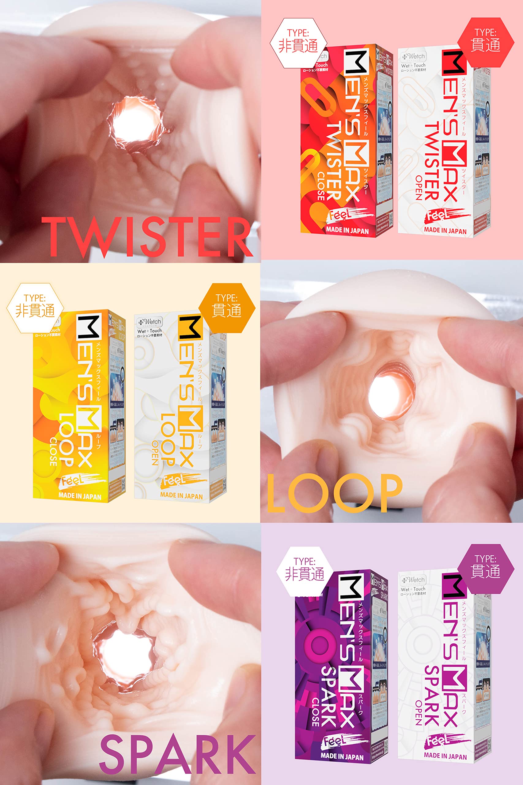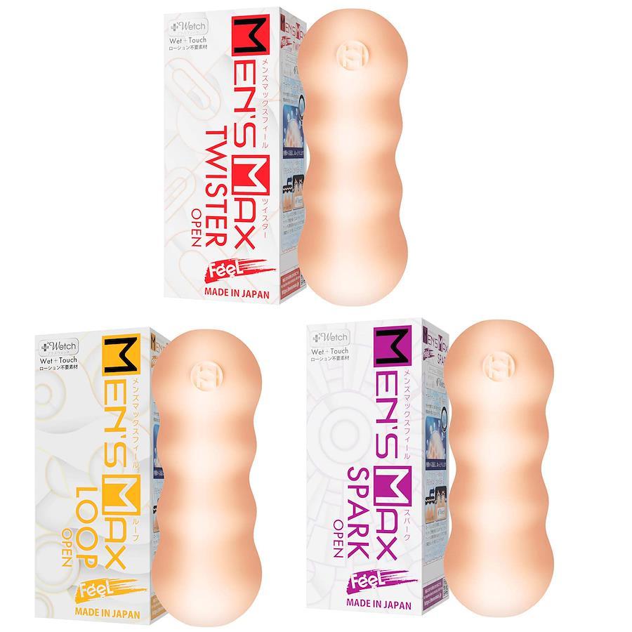 ※ぬめりが弱いと感じる場合は付属のポケットローションをご利用ください。 【原産国】日本 【本体商品サイズ】 高さ138mm幅52mm奥行52mm 【内容量】本体3個(貫通ホール152g×3)、メンズマックスポケットローション3個(7ml×3) 【ローション不要素材プラスウェッチ】水をかけるだけでねっとり濡れる、ローション不要の特許技術です。ご家庭にある水で即座に使え、使用後は洗って乾燥させれば複数回までお使いいただけます。 【MEN'S MAX FEEL TWISTER OPEN内部構造】ボリュームのある突起がうねるように回転して広範囲を複雑に刺激。シンプルながらしっかり刺激するツイスト構造。【MEN'S MAX FEEL LOOP OPEN内部構造】エッジの効いたループと弾力のあるループを全体に配置。絡みまとわりつく2つのエリアのコントラストが1度に楽しめる。【MEN'S MAX FEEL SPARK OPEN内部構造】大きなボール・イボ・ヒダが特徴的な構造。ストロークするたびに内部構造が揺れ動き弾むように刺激する。