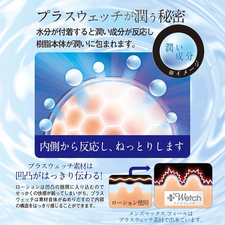 【ローション不要素材プラスウェッチ】水をかけるだけでねっとり濡れる、ローション不要の特許技術です。ご家庭にある水で即座に使え、使用後は洗って乾燥させれば複数回までお使いいただけます。