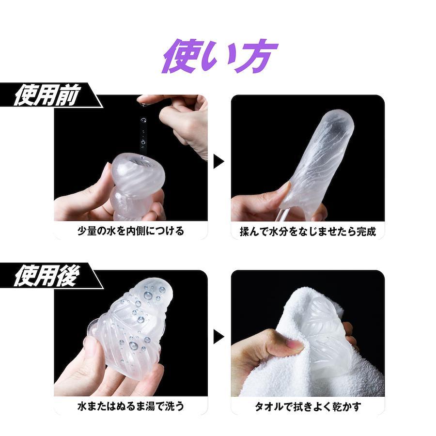 「HD(High Definition)成形」で突起のデコボコ感がさらにクッキリになりました。突起に触れたときの粒立ちが違います。【ウェーブ内部構造】「連続で打ち寄せる触感の波」ウェーブ状のヒダが絶え間なく打ち寄せる触感の波をもたらす【ドット内部構造】「細かなイボの精細な刺激」無数に配置されたツブツブ突起が全体を繊細に刺激する【シャワー内部構造】「優しく降り注ぐまったりヒダ」まったりと撫で付けるヒダは優しく降り注ぐシャワーのように【コンボ内部構造】「リングとツブのメリハリ刺激」大型リングとツブが交互に迫り来る刺激のメリハリ連続攻撃【キャンディー内部構造】「密集した四角錐の高刺激」整然と敷き詰められた四角錘の突起【クリーム内部構造】「吸い込まれるトルネード構造」斜めに擦り上げてくるヒダはクリームのように昇りつめる絶頂感【ベリー内部構造】「全体を覆う繊細で優しい突起」フワフワとした起毛が包み込みまったりしたなめらかな触感【カカオ内部構造】「反り返りのあるヒダの多層構造」ビッシリ並んだヒダは反発しながら複雑に絡みつく刺激【クリオネ内部構造】「スジ・イボ・ヒダの多彩な刺激」大ぶりの突起たちが全体を大胆に刺激する【ジェリーフィッシュ内部構造】「動かすたびに突起が弾ける刺激」長めに作られた突起が全体を弾いて刺激する【オクトパス内部構造】「張り巡らされた吸盤が吸い付く」吸盤とイボが密着し触感を生み出す【スクイッド内部構造】「突き上げるように延びた触感ライン」大きく隆起をしたスリットが奥へ奥へといざなう【ご使用方法How to use】