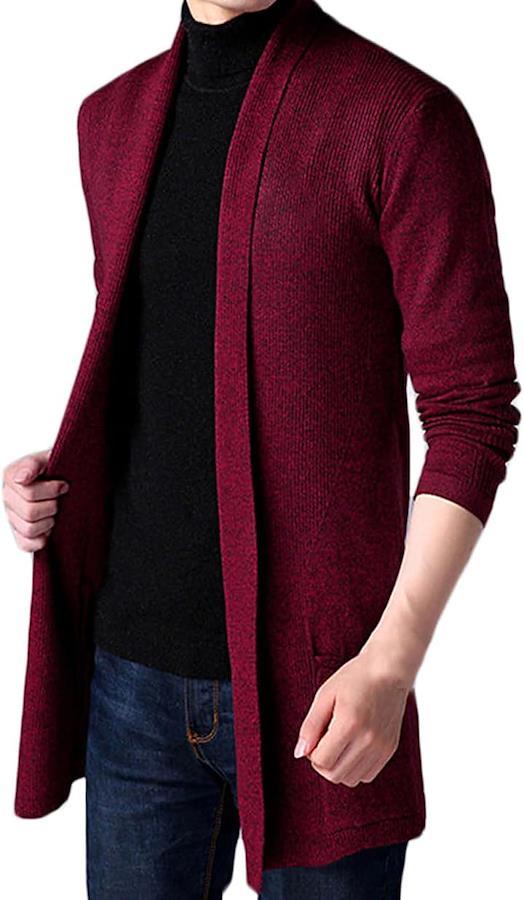 メンズ用 カーディガン、スリムに見せるシルエットがかっこいい、丈の長めな ロングカーディガンです。