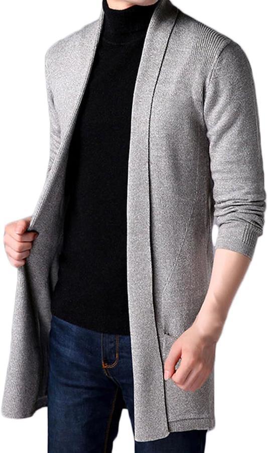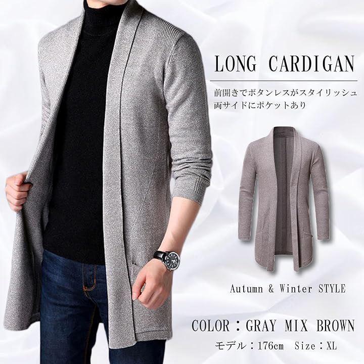 メンズ用 カーディガン、スリムに見せるシルエットがかっこいい、丈の長めな ロングカーディガンです。