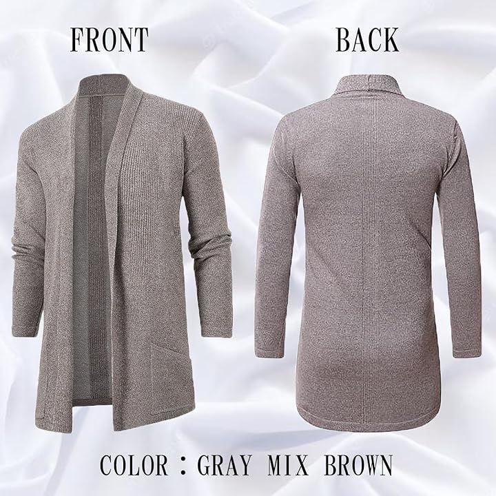 メンズ用 カーディガン、スリムに見せるシルエットがかっこいい、丈の長めな ロングカーディガンです。