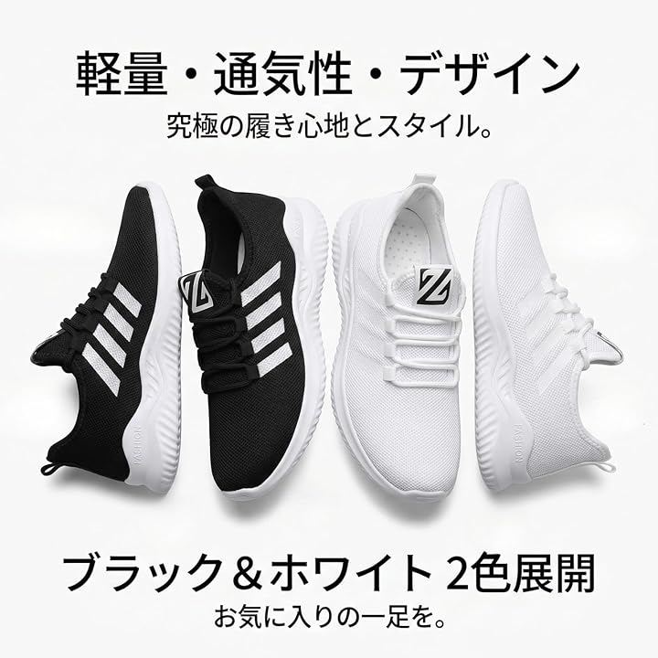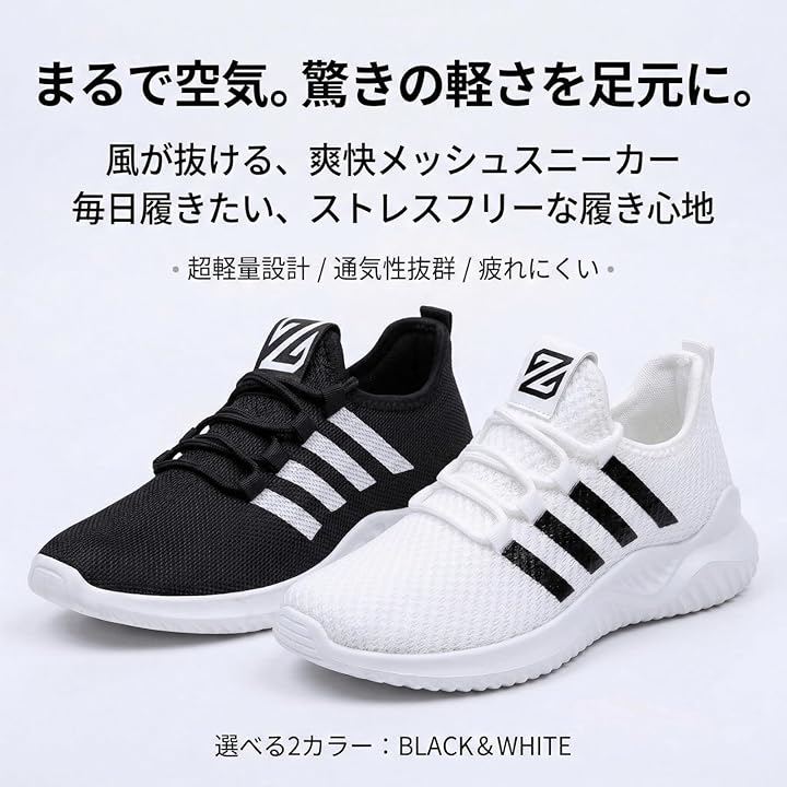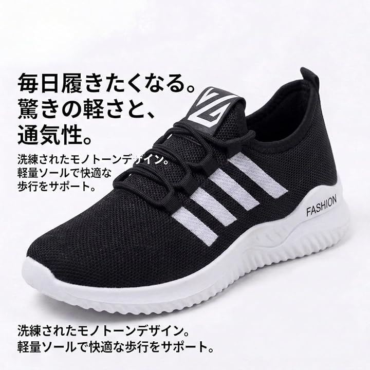 「通気性」一体織りメッシュは、軽量、通気、速乾など機能が優れて、熱がこもるのを防ぎ、さわやかな履き心地を提供してくれます。