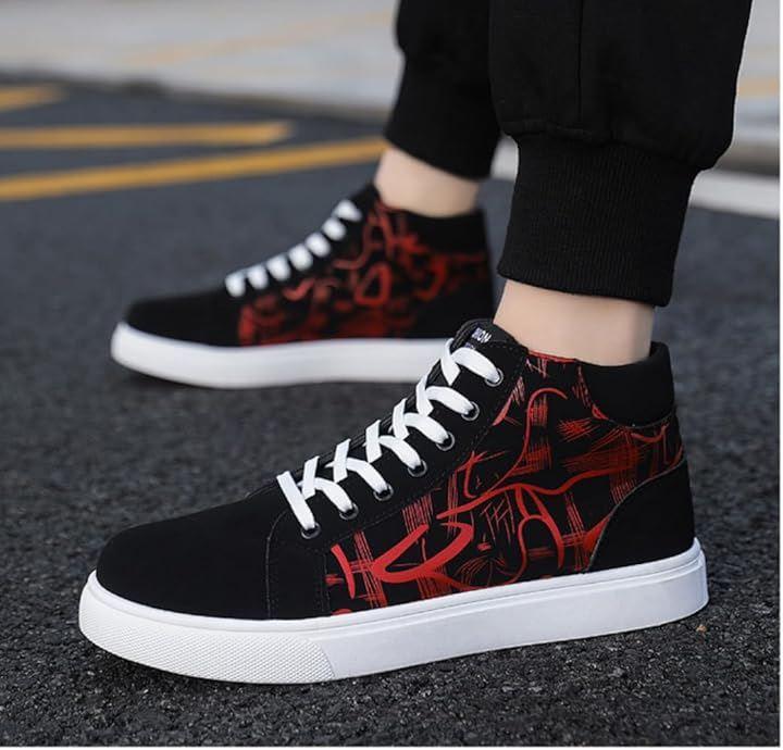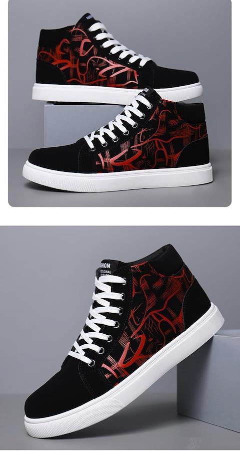 仕様1:印象的なグラフィックデザインが魅力のハイカットスニーカー:黒を基調としたアッパーに大胆なラインがあしらわれたハイカットスニーカーは、ストリート感あふれる存在感で足元からスタイルを引き立てます。