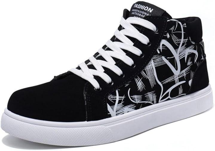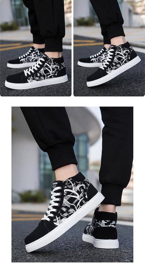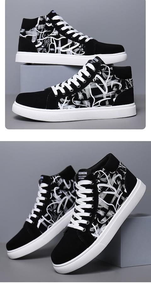 仕様1:印象的なグラフィックデザインが魅力のハイカットスニーカー:黒を基調としたアッパーに大胆なラインがあしらわれたハイカットスニーカーは、ストリート感あふれる存在感で足元からスタイルを引き立てます。