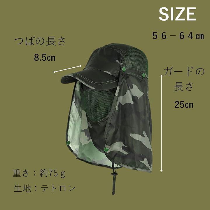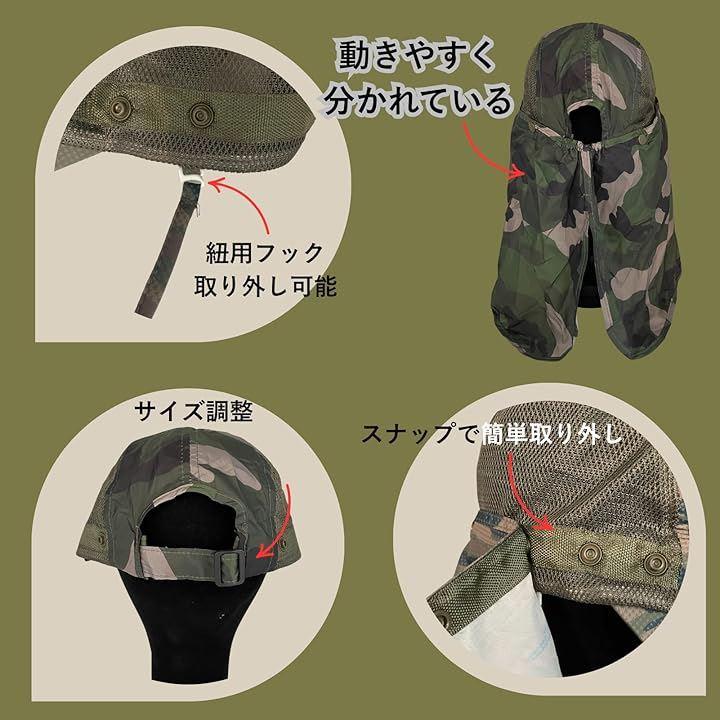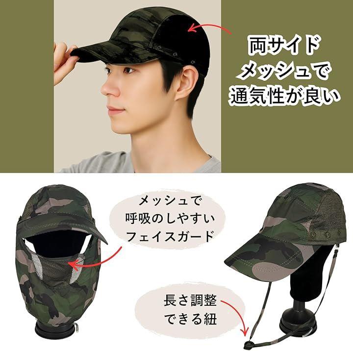 「顔・首をしっかりガード。快適メッシュ素材の作業用帽子」 このキャップは、取り外し可能なフェイスカバーとネックカバーが一体となったデザインで、顔全体から首までを紫外線から徹底的にガードします。