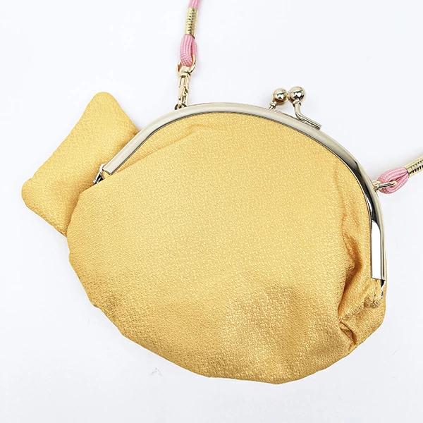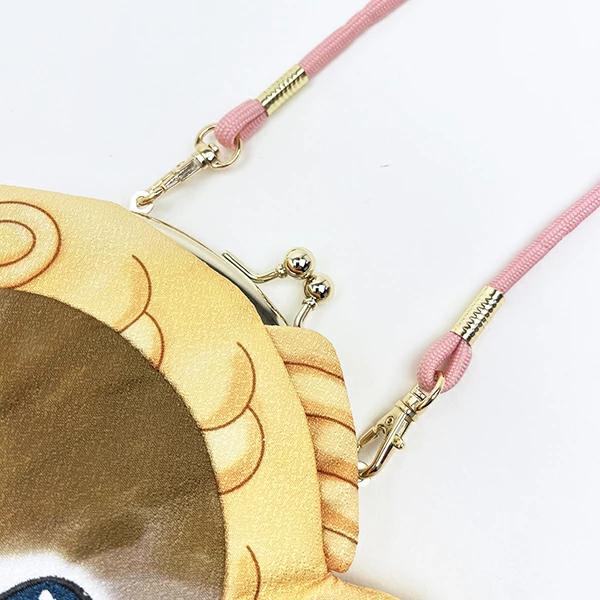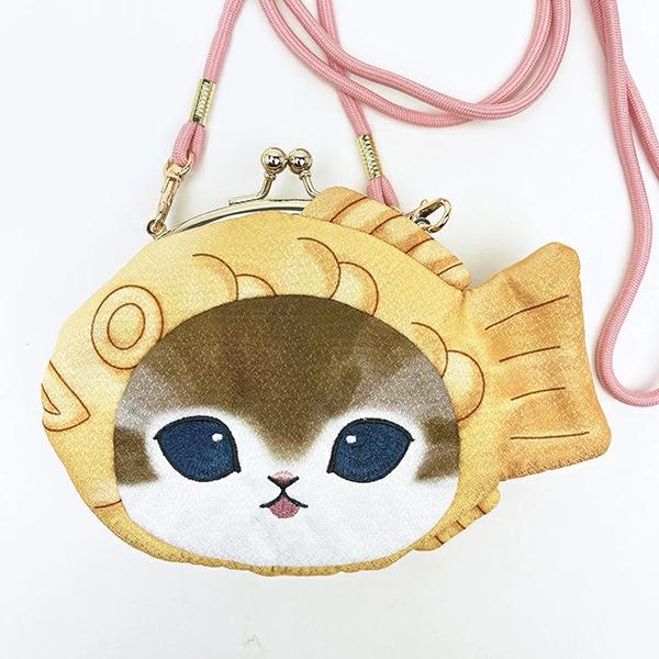 モフサンドのがま口ポーチ。ショルダー紐付きがま口ポーチなので、首からかけられます。被り物をしたにゃんこのお顔がポイント☆