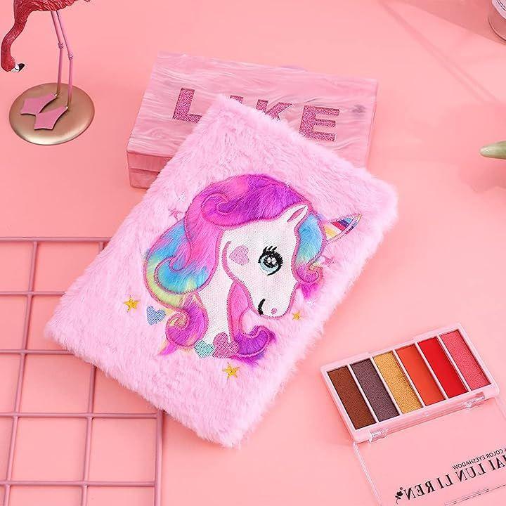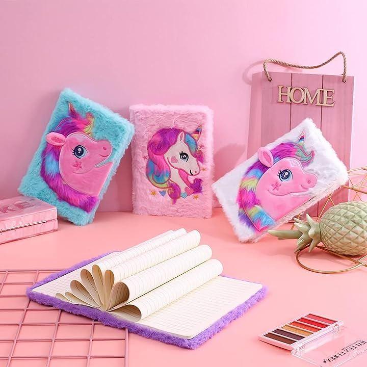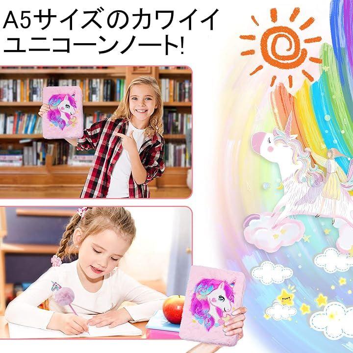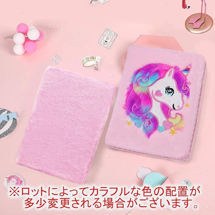 ノートの表紙と裏表紙がフカフカの手触り抜群の長めの毛で覆われていて、表紙にはパステルカラーのカラフルな毛で表現されたカワイイユニコーンが特徴的です。