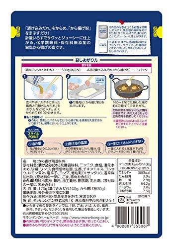 原材料:漬け込みだれ[発酵調味料、ニンニク、食塩、還元水あめ、砂糖、リンゴ、食用植物油脂、生姜、チキンエキス、コショウ、レモン果汁、唐辛子、コンブ、増粘剤(キサンタン)、香辛料抽出物、(原材料の一部に、ごま、豚肉を含む)]、から揚げ粉[小麦粉、澱粉、加工澱粉、膨張剤、乳化剤、(原材料の一部に、乳を含む)]