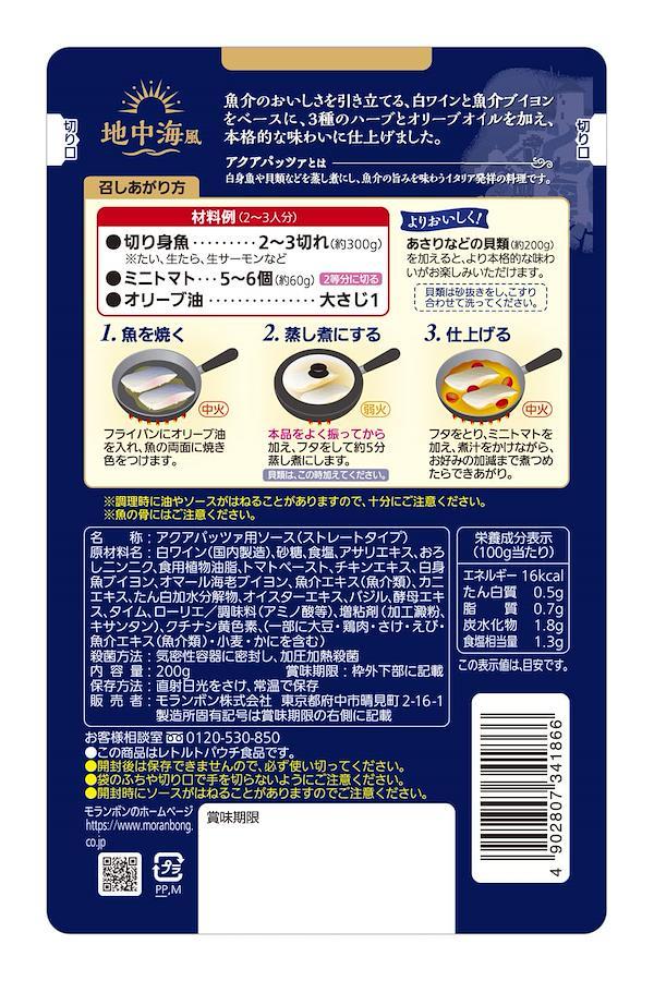 白ワインと魚介ブイヨンをベースに、3種のハーブとオリーブオイルを加え、魚介の旨みが引き立つ味わいに仕上げました。アクアパッツァとは、白身魚や貝類などを蒸し煮にし、魚介の旨みを味わうイタリア発祥の料理です。フライパンでかんたん。ストレートタイプです。あさりなどの貝類を加えると、よりおいしく召し上がれます。