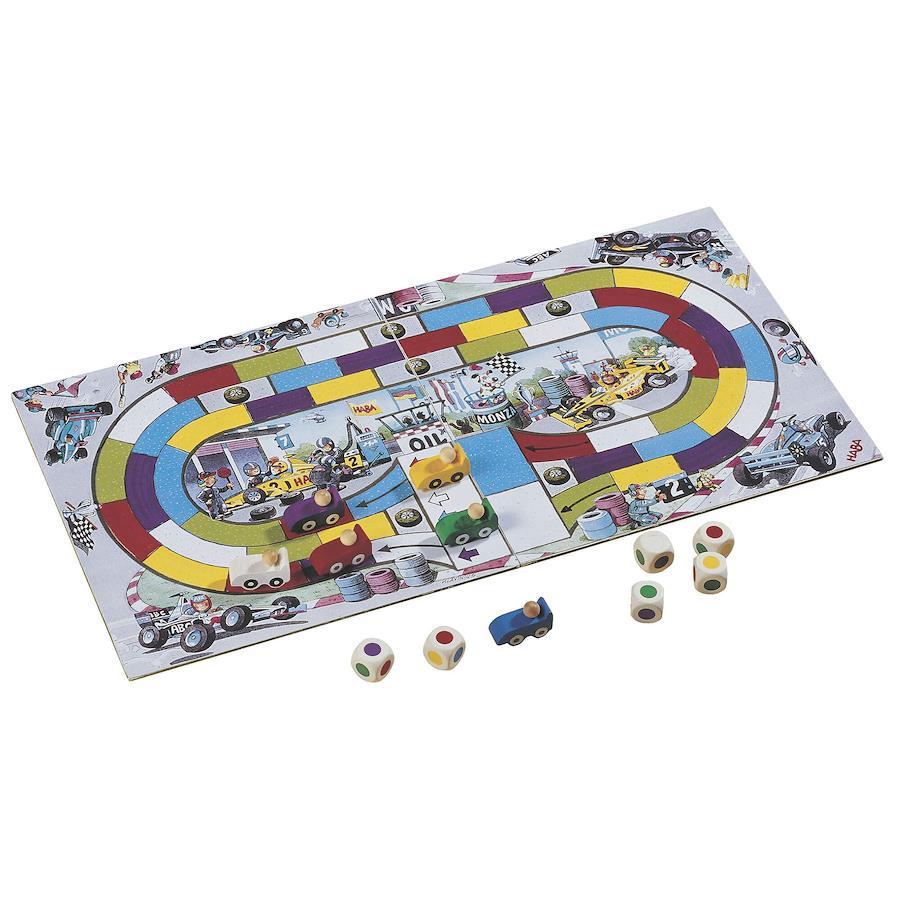 プレイ人数:2-6人 プレイ時間:約15分 対象年齢:5才- 色サイコロを振ってコースを1周するすごろくゲーム。自分の順番には6個の色サイコロを振り、自分のマシンの進路のマスの色と見比べて同じ色が出ているマスまでマシンを進めることができます。 コースを1周して一番最初にゴールできた人が勝ち!自分のマシンを進める方法が普通のすごろくとはちょっと違って面白い!運と戦略でゴールのチェッカーフラッグを目指そう!