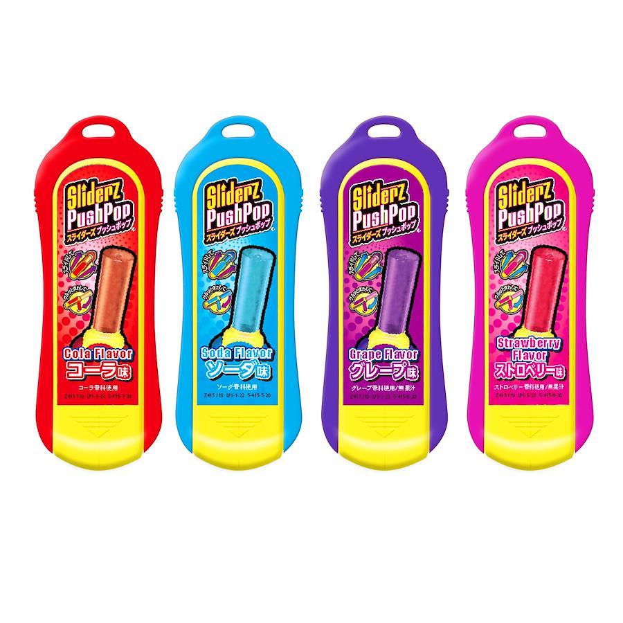 プラスティックのケースをシュッっとスライドしてクルッと回してキャンディーを取り出すアクションが楽しい商品です。好きなだけなめたら残りはしまっておけます。フレーバーはコーラ・グレープ・ソーダ・ストロベリーの4種類。