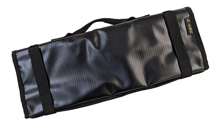 生地全面にターポリン素材を使用した”JAGUY BLACK LINEシリーズ”表面 撥水加工よりハードに!より無骨に!をテーマとしたニューラインナップの1モデルです。折りたたみ式ロール収納タイプ ペグやハンマーを収納するポケット5個に変更、全面ファスナー付きメッシュポケットも付きます。ペグを抑えるゴムベルトも幅広に修正しました。全面 汚れを落としやすく耐久性のあるターポリン素材