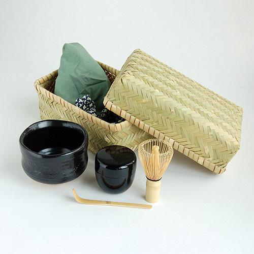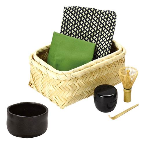 抹茶の道具を、持ち運びに便利な竹かごのケースに収めました