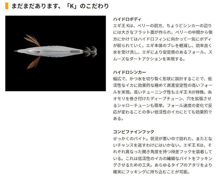 エギ王Kは変わり続けるフィールドに対応するために生まれた、低活性のイカまでも釣るためのエギ。今まで諦めていたイカを獲る。