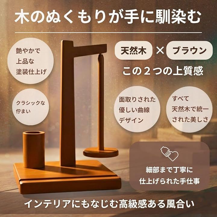 「重厚な天然木の安定感|深型カップで道具も整理整頓」 上質な天然木を贅沢に使用したブラウンの台座は、重厚で安定感があり、編み物中の揺れや転倒を防ぎます。