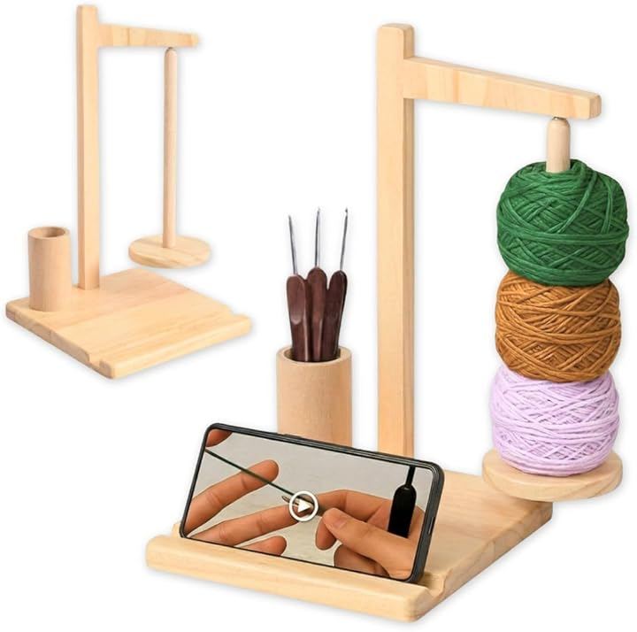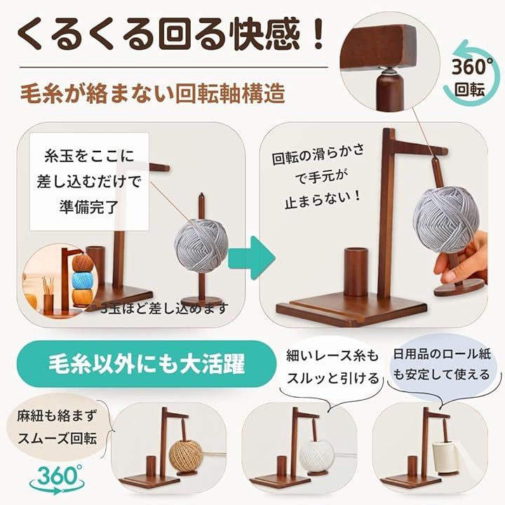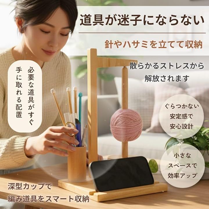 「商品詳細」 <素材>天然木 <構造>360度磁気回転式/毛糸スピンドル1本(約3玉対応)/スマホスタンド/深型ツールカップ <機能>絡まり防止/安定ベース(滑り止め付き)/取り外しスピンドル <用途>かぎ針編み・棒針編み・セーター・帽子・マフラー・人形制作など、幅広い手作りに役立ち、快適な編み時間をサポートします。