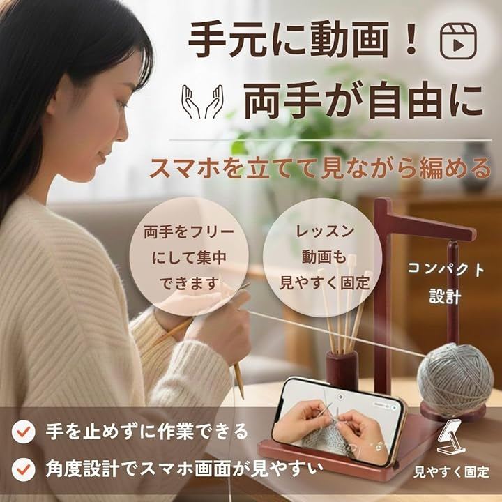 「スマホスタンドで動画を見ながら編める快適設計」 スマホスタンドを備えているため、レッスン動画を見ながらの編み物や、編み図の確認がスムーズに行えます。