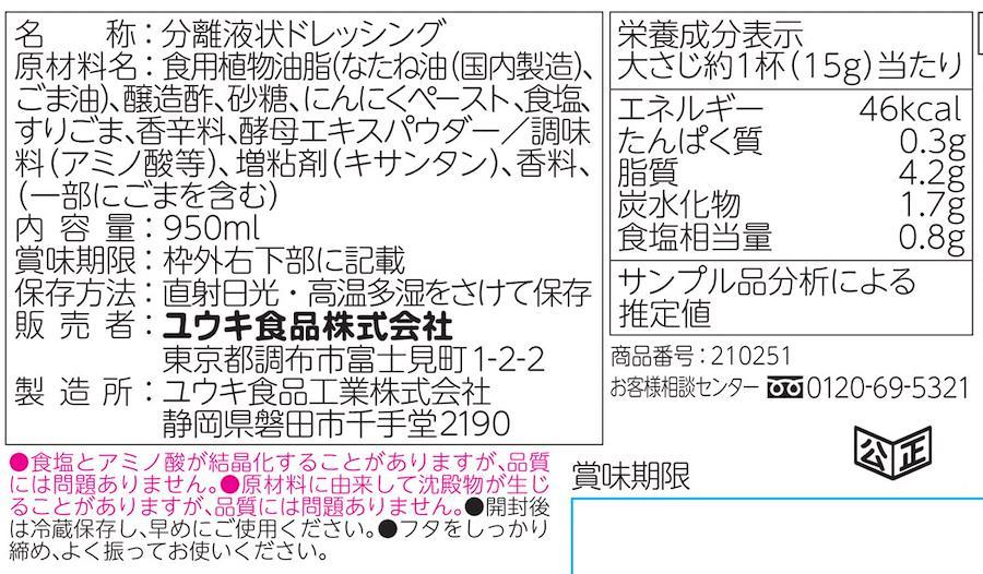 原材料: 食用植物油脂(なたね油(国内製造)、ごま油)、醸造酢、砂糖、にんにくペースト、食塩、すりごま、香辛料、酵母エキスパウダー/調味料(アミノ酸等)、増粘剤(キサンタン)、香料、(一部にごまを含む)