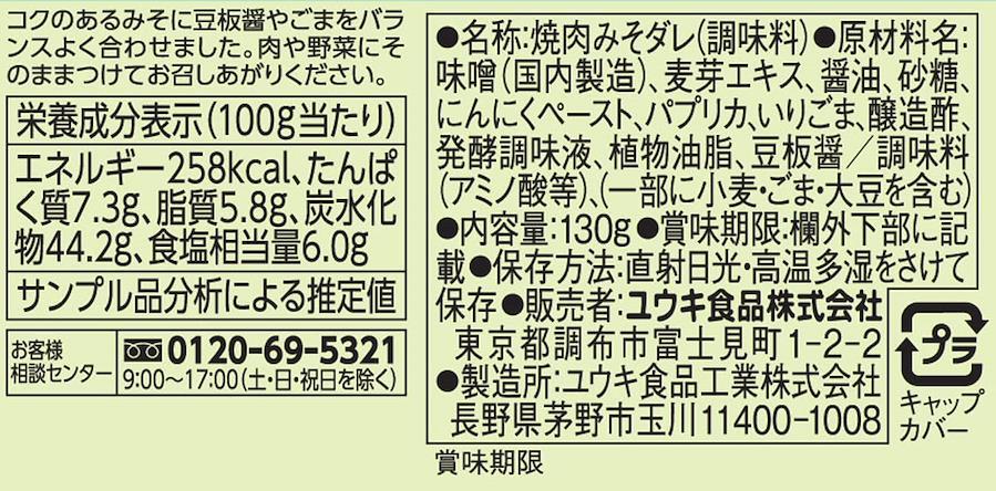 味噌(国内製造)、麦芽エキス、醤油、砂糖、にんにくペースト、パプリカ、いりごま、醸造酢、発酵調味液、植物油脂、豆板醤/調味料(アミノ酸等)、(一部に小麦・ごま・大豆を含む)