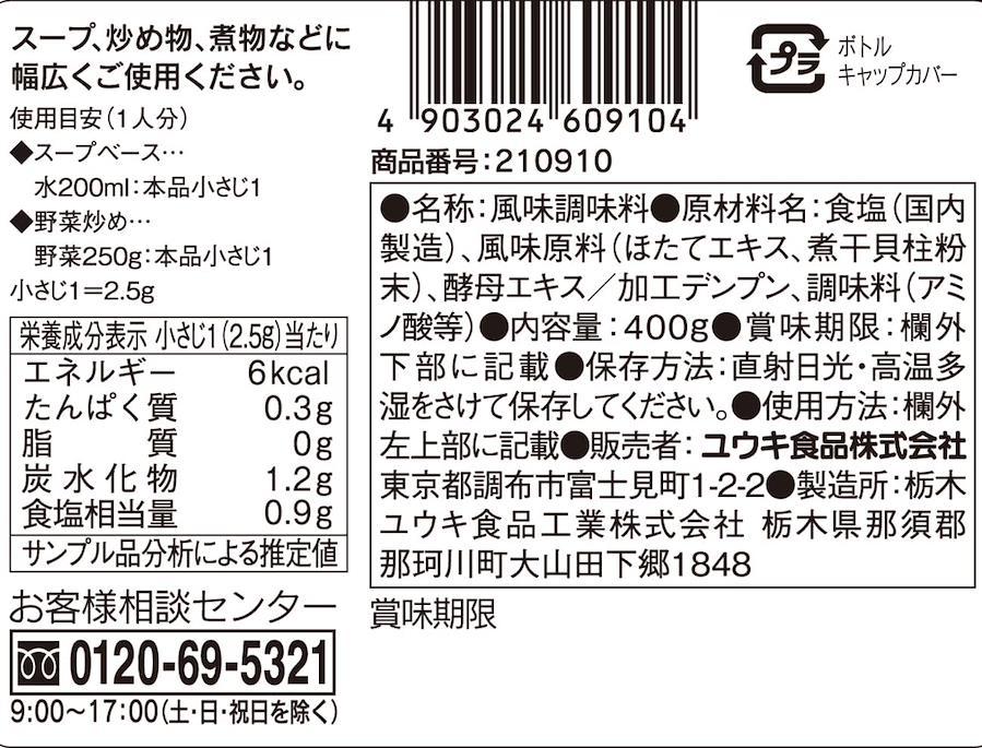 原材料:食塩(国内製造)、風味原料(ほたてエキス、煮干貝柱粉末)、酵母エキス/加工デンプン、調味料(アミノ酸等)
