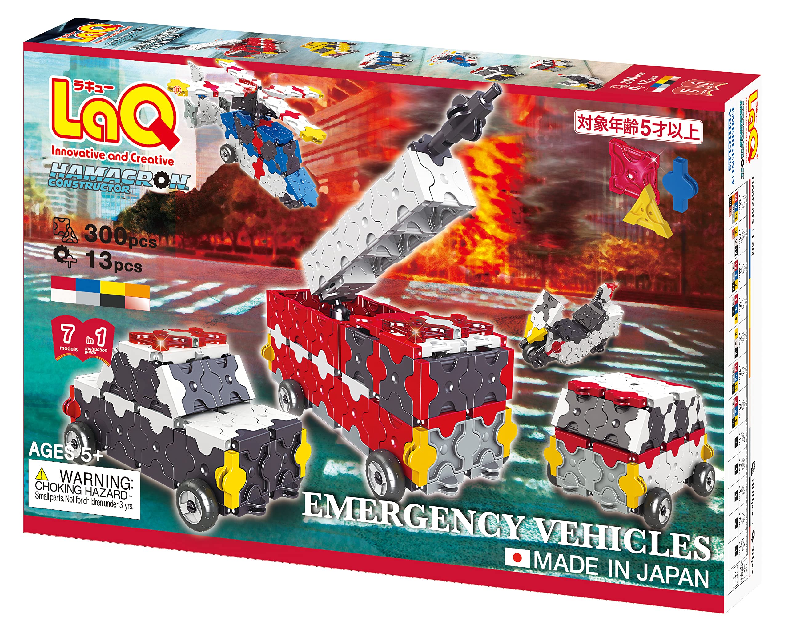 乗り物好きの方におすすめ! お馴染みの緊急車両が作れるキットです。「消防車」はボールジョイントパーツを使ってハシゴが可動するギミックつき。【つくれるモデル】は7種類! 白バイ、救急車、パトカー、警察ヘリコプター 、警官護送車 、道路パトロールカー、消防車■「LaQ(ラキュー)」は四角と三角の基本パーツと5種類のジョイントパーツをつなげて、色々なものが作れる知育玩具です。パーツを組み立てる動作は、右脳と左脳の両方を刺激し、想像力や思考力の発達を促します。国内・海外で多くの賞を受賞している【日本製のブロック】です。