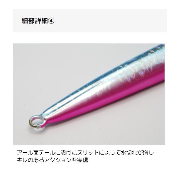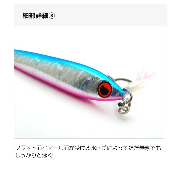 ●フラット面とアール面の左右(表裏)非対称デザイン。●ただ巻きでウォブリング、STOP&GOでクイックアクション。●フリーフォールではヒラヒラと大きくスライドしスローに水平フォール。●ウェイト毎に最適なバランスを追求したボディ設計。●そのまま使える魚皮ティンセル仕様の専用HOOK搭載。 全長(mm):100 重量(g):60 ※実物と色が違って見える場合があります。あらかじめご了承下さい。