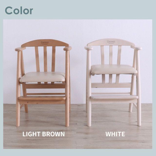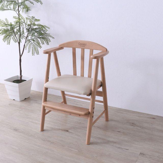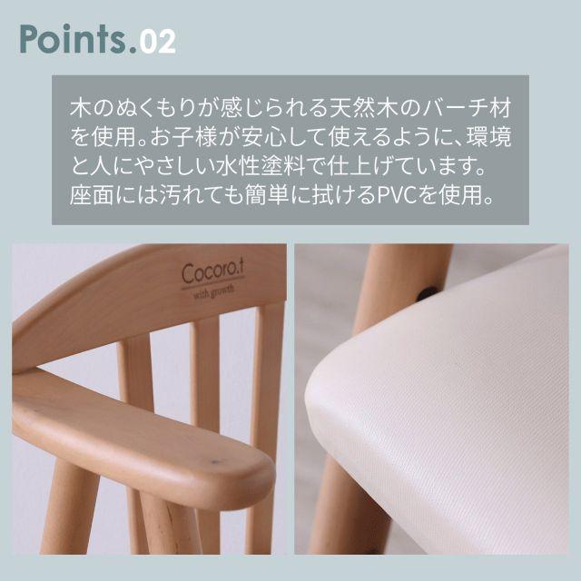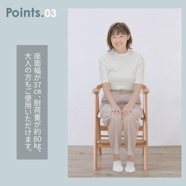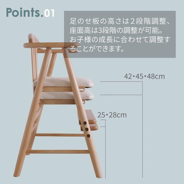 01.ワイドな座面で耐荷重は約80kg、大人の方もご使用いただけます。02.座面高は3段階、足のせ板は2段階に調整可能。お子様の成長に合わすことができます。03.肘掛けもあり、着席時の姿勢が安定しやすい設計にしています。04.座面には汚れが落としやすい合成皮革(PVC)を使用。05.床をキズつきにくくするために、脚裏に貼るフェルトを付属。06.お子様が安心して使えるように、人と環境にやさしい水性塗料で仕上げています。07.シンプルでどんなお部屋にも合わせられるデザイン。