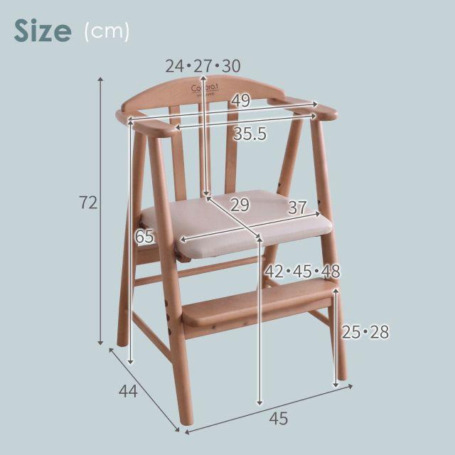 〈製品規格〉■サイズ:幅49×奥行44×高さ72×座面高42・45・48cm■重量:約5.5kg■耐荷重:約80kg■材質:天然木(バーチ材)、水性アクリル塗料、ウレタンフォーム、PVC■組立:完成品でのお届けとなります。■対象年齢:生後7ヵ月〜(あくまで目安です、お座りができるようになってからご使用可能)■お手入れ方法:著しい汚れを落とす際は、ぬるま湯に市販の中性洗剤を3〜4%に薄め、柔らかい布で叩くように拭き取ってください。シンナー、アルコール、ベンジン等の有機溶剤は絶対に使用しないでください。変色や色落ち、品質の低下に繋がります。