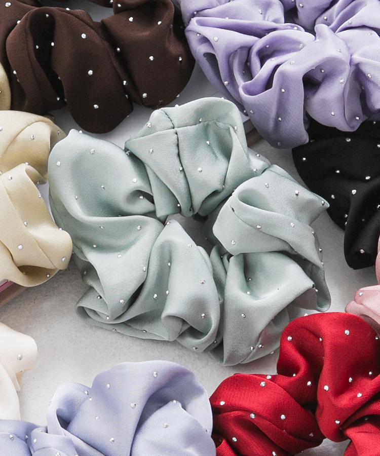 動くたびにきらきら煌めくラインストーンが可愛いサテンシュシュ。