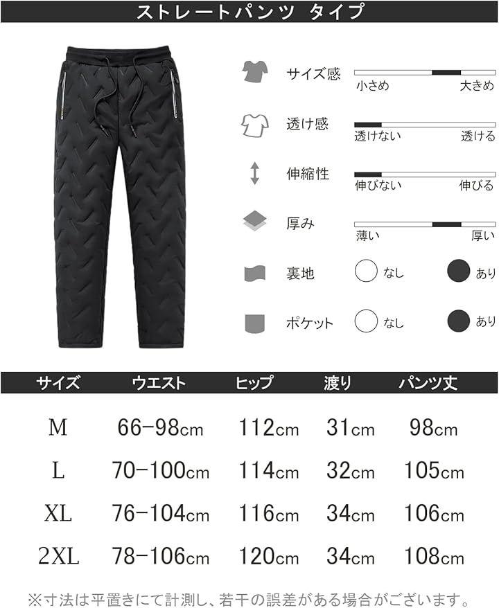 ジョガーパンツタイプ:ウエスト/ヒップ/渡り/パンツ丈/裾口 「M」68-102cm/114cm/31cm/95cm/11 「L」70-104cm/120cm/31cm/98cm/11 「XL」74-106cm/122cm/34cm/103cm/11 「2XL」76-108cm/126cm/34cm/104cm/12 ストレートパンツタイプ:ウエスト/ヒップ/渡り/パンツ丈/裾口 「M」66-98cm/112cm/31cm/98cm/18 「L」70-100cm/114cm/32cm/105cm/18 「XL」76-104cm/116cm/34cm/106cm/19 「2XL」78-106cm/120cm/34cm/108cm/20
