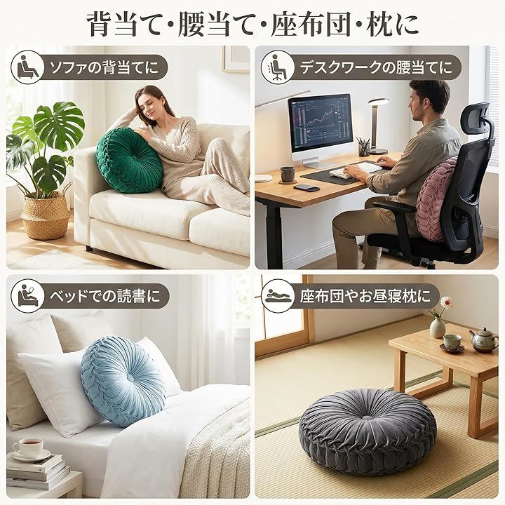 「快適なくつろぎタイム」在宅ワークの腰サポート、読書時のソファクッション、和室での座布団、お昼寝枕など様々なシーンで活躍。