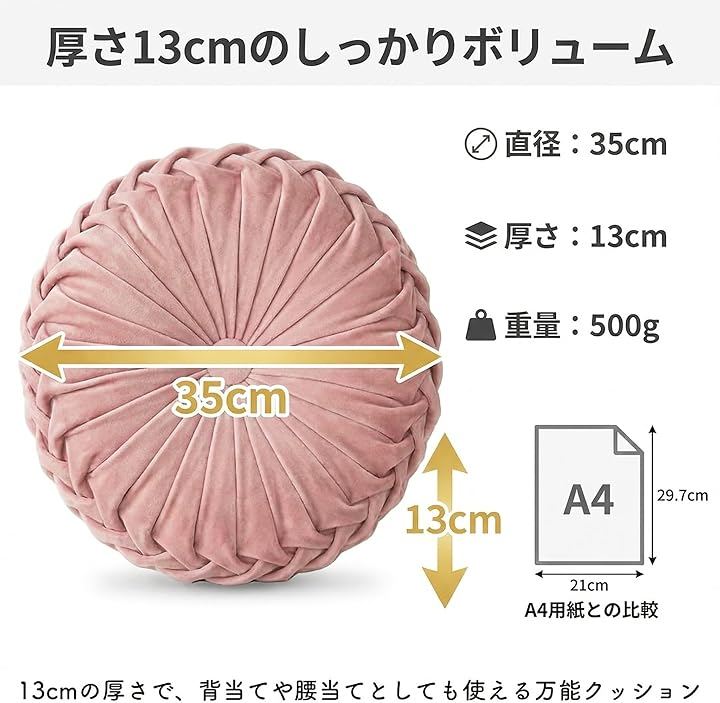 「選べる全14色展開」直径35cm・厚さ13cm・重量500g、表地ベロア調ポリエステル・中材ポリエステル綿。