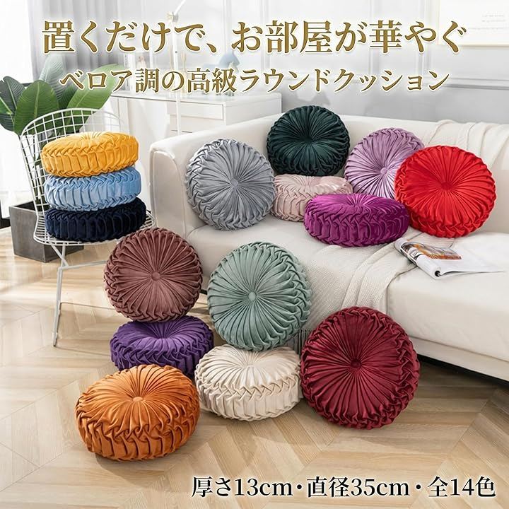 「選べる全14色展開」直径35cm・厚さ13cm・重量500g、表地ベロア調ポリエステル・中材ポリエステル綿。