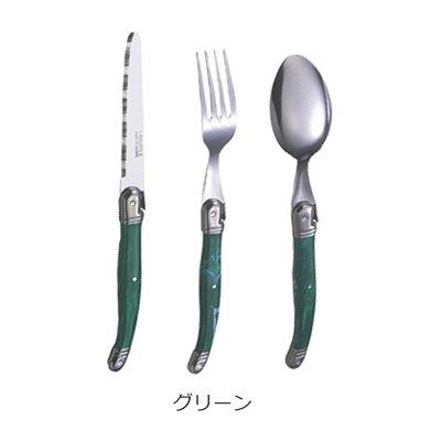 通常1-5営業日で発送:カジュアルに使用できるラギオールシリーズのカトラリー。 ハンドメイドではなく、マシンメイド品なのでお買い求めやすいカトラリーです。 フォーク部分はしっかりステンレス。『LAGUIOLE』と『MADE IN FRANCE』の文字が刻印されています。 ハンドル部分はABS樹脂素材、マーブル模様がキレイで色も鮮やか。1商品、1商品、マーブル模様が違うので、これも一つの味として、「2つしかない」フォークを楽しんでください。 ハンドル部分の形状は、握った手にしっくりおさまる湾曲した作りになっています。ナイフとフォー ! !