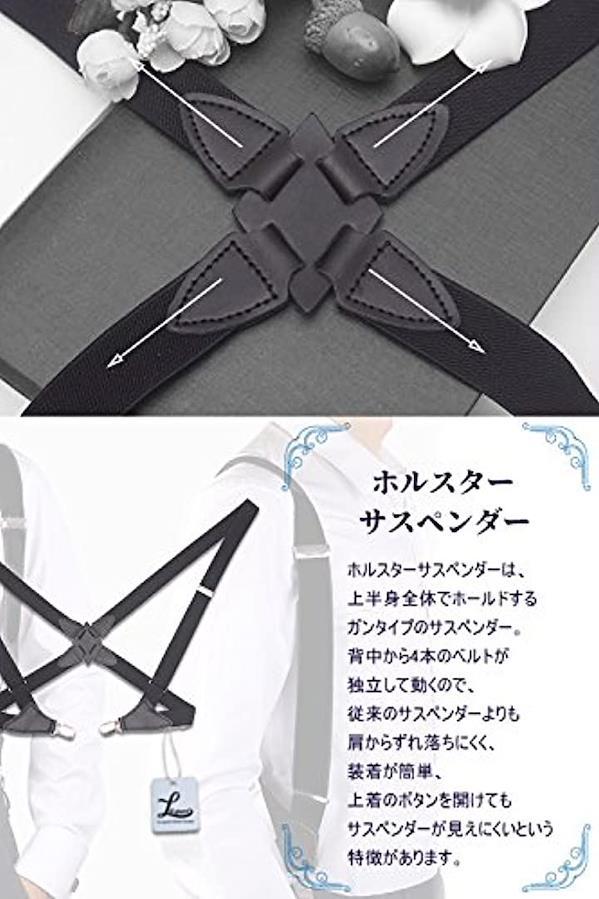 背中を起点にした4つのベルトが独立して動く、ホルスタ ー型サスペンダー。