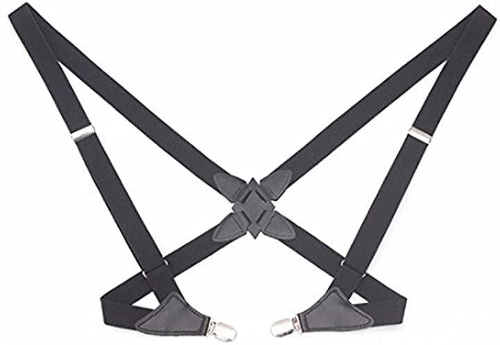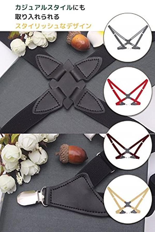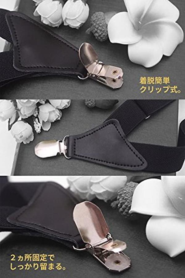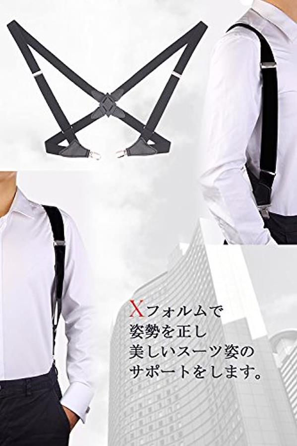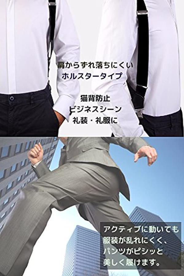 上着のボタンを開けてもサスペンダーが見えにくく、肩からずれ落ちにくいという特徴があります。