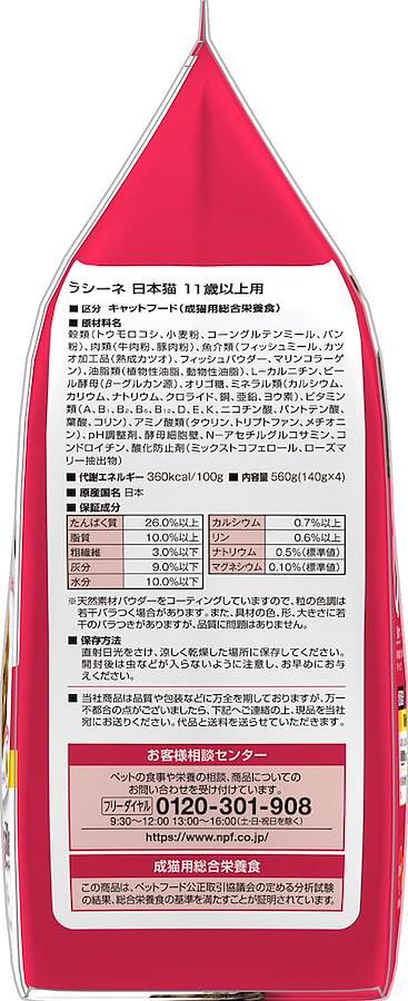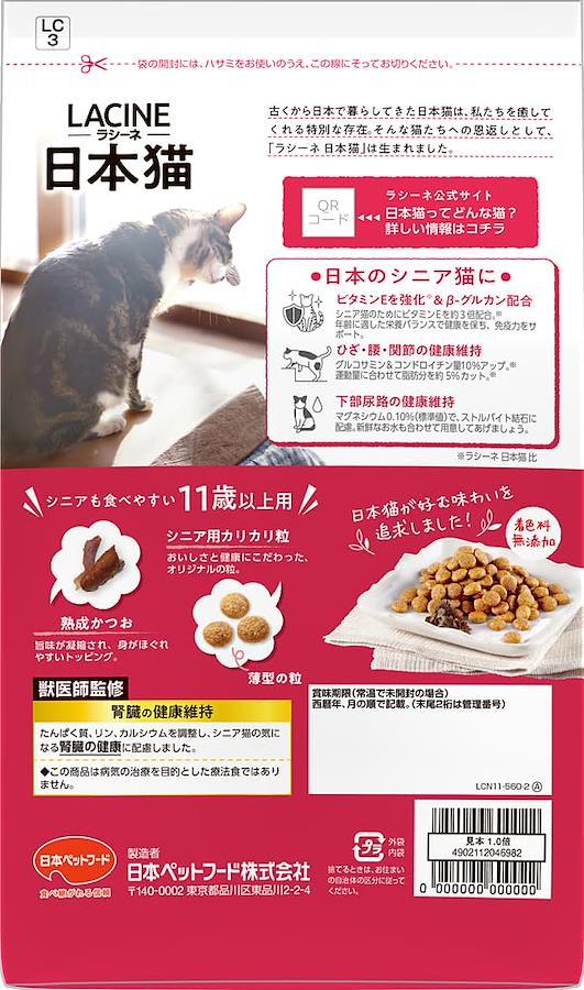 ○古くから日本で暮らす「日本猫」のための専用フード。○獣医師監修。○腎臓の健康維持。(たんぱく質、リン、カルシウムを調整)○シニア猫も食べやすいトッピング「熟成かつお」入り。○着色料無添加。フィッシュ&チキン味のおいしい粒。薄型仕上げ。○日本のシニア猫に配慮した栄養設計。【ビタミンEを強化&β-グルカン配合】ビタミンEを約3倍配合(ラシーネ日本猫比)。年齢に適した栄養バランスで健康を保ち、免疫力をサポート。【ひざ・腰・関節の健康維持】グルコサミン・コンドロイチン量10%アップ&運動量に合わせて脂肪分を5%カット。(ラシーネ日本猫比)【下部尿路の健康維持】マグネシウム(標準値:0.10%)でストルバイト結石に配慮。【室内猫の心の健康維持】トリプトファンを配合し、心の健康をケア。○成猫用総合栄養食。○小分け4袋入り。○国産。