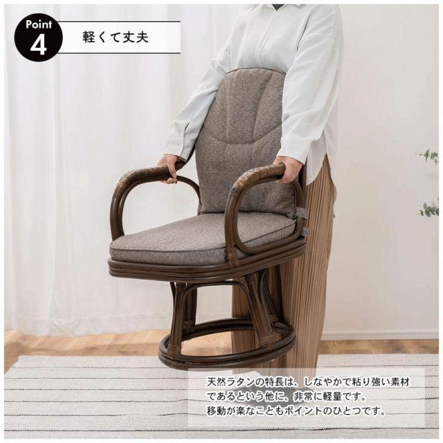 ●天然ラタンのしなやかな曲線を活かした座椅子。●天然素材の風合いを感じながらゆったりとおくつろぎください。●背もたれは籠目に編み込まれています。●インテリアになじむ風合いとディティール。●天然素材の豊かな表情を活かしたカラーリングとしなやかな曲線で表現された特別な座椅子です。●軽くて丈夫。●クッションは取り外し可能。●立ち座りがしやすいアームのグリップと、背もたれには持ち手が付いて持ち運びにも便利です。●座椅子部分は360度回転するので、その場で自由に体の向きを変えることができます。